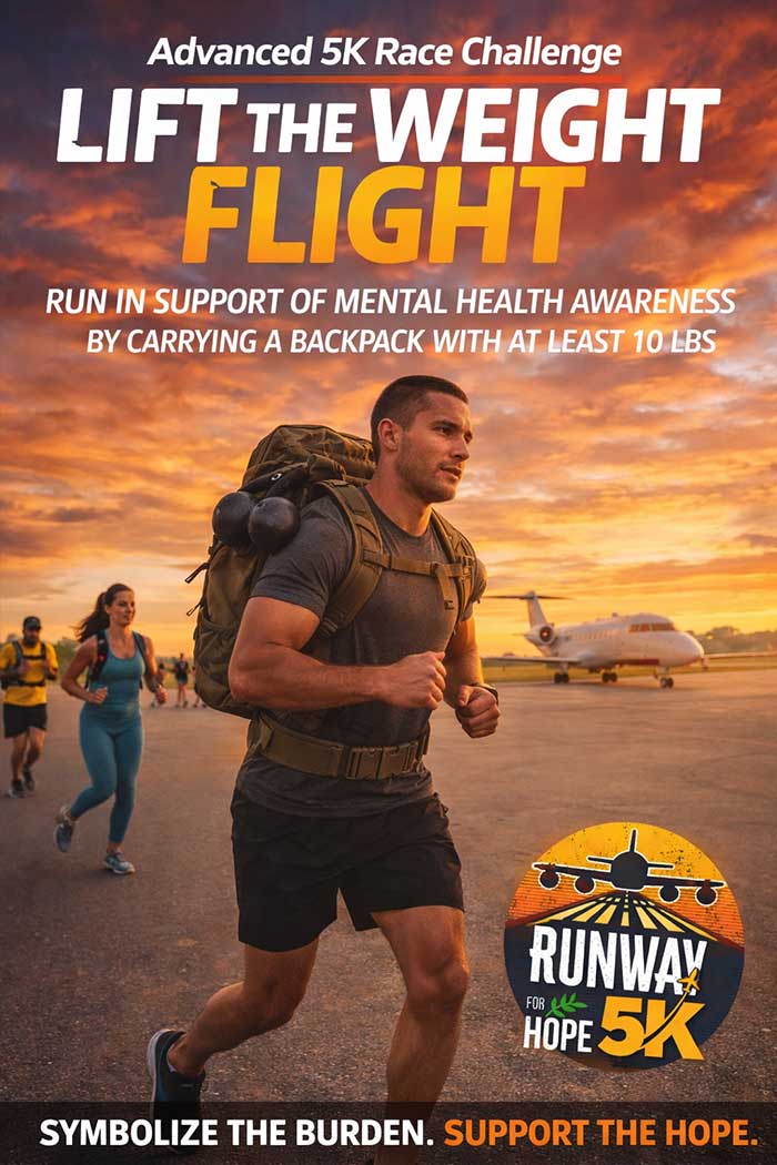 Symbolizing the invisible weight of mental health struggles. Runners may choose to wear a backpack or vest of at least 10 pounds. Lifting the weight in support of those who carry these burdens every day.