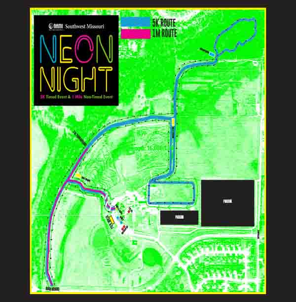 Here we Glow! It’s time for the NEON Night Run/Walk, NAMI Southwest Missouri’s annual event for Suicide Prevention. This 5k timed event and 1 mile non-timed event is a glowing experience with illuminating lights and neon glow. This is the area’s coolest, most eye dazzling nighttime 5K and 1 mile featuring an illuminated trail, sounds of our Amazing DJ, the glow Zone and a Photo Booth! Participants will receive a unique t-shirt and glow gear. The illuminated Memorial Garden is a place where participants can remember those lost to suicide through the purchase of a plastic lighted luminary.